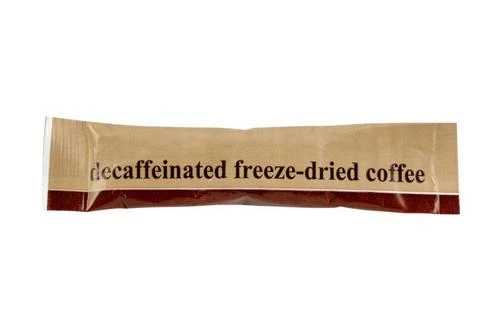 Portion of decaffeinated freeze dried coffee contained in printed sachet
