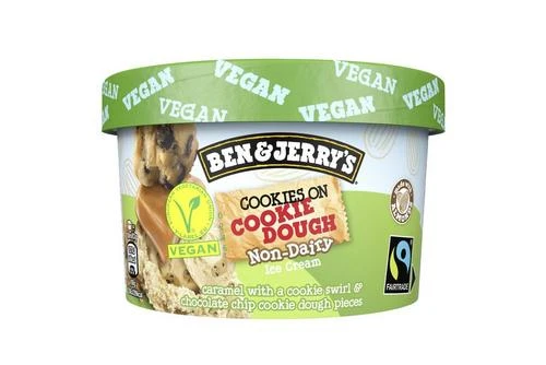 Non-dairy caramel ice cream with a cookie swirl (16%) and chocolate chip cookie dough (16%)