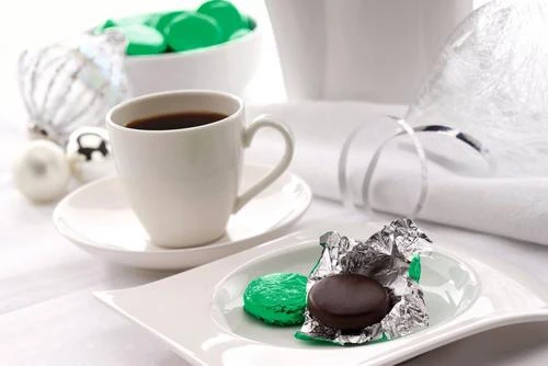 Individually green foil wrapped dark chocolate (55% Cocoa) discs with naturally mint flavoured fondant centre. Perfect for serving at the end of a meal and truly delicious.