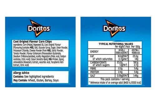 Case of 32 single packs of Doritos Cool Original Tortilla Chips (40G). Doritos is the number 1 Sharing brand in Impulse (source: Nielsen, Total Impulse, MAT we 09.02.19) Doritos are VAT free. Our Doritos Cool Original Tortilla Chips 40g are recommended for stocking in Education