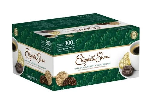 Elizaeth Shaw Dark mint crisp indiviually wrapped in gold and available in a 300 piece pack.Suitable for Vegans .