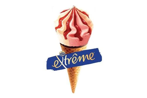 Strawberry ice cream and cream flavour ice cream in a biscuit cone (12%) with chocolate flavour coating and red fruit sauce (12%).