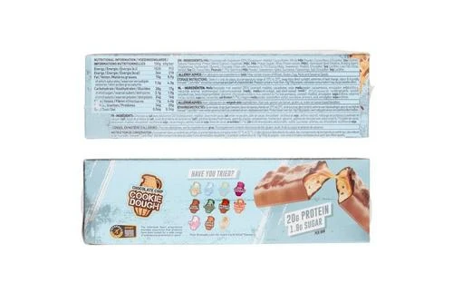 MILK Chocolate with Sweetener (20%) (Sweetener (Maltitol), Cocoa Butter, Whole MILK Powder, Cocoa Mass, Emulsifier (SOY Lecithin), Flavourings), Protein Blend (Calcium Caseinate (MILK), MILK Protein Isolate, Whey Protein Isolate (MILK)), Bulking Agent (Polydextrose), Hydrolysed Beef Gelatine, Humectant (Glycerol), Chocolate Chips with Sweetener (6.7%) (Cocoa Mass, Sweetener (Maltitol), Emulsifier (SOY Lecithin), Low Fat Cocoa, Vanilla), SOY Oil, Cocoa Nibs, PEANUTS (1.7%), Skimmed MILK Powder, Sweeteners (Xylitol, Sucralose), Flavourings, Salt, Emulsifier (SOY Lecithin).