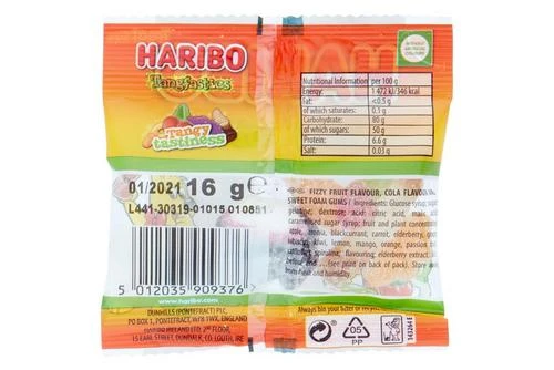 Glucose syrup, sugar, gelatine, dextrose, acids (citric acid, malic acid), acidity regulators (calcium citrates, sodium hydrogen malate), caramelised sugar syrup, fruit and plant concentrates (apple, aronia, blackcurrant, carrot, elderberry, grape, hibiscus, kiwi, lemon, mango, orange, passion fruit, safflower, spirulina), flavouring, elderberry extract, glazing agent (carnauba wax).