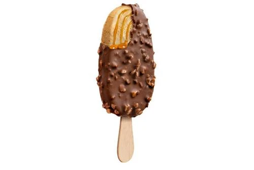 Vegan salted caramel ice cream with caramel sauce surrounded by compound coating and cinder toffee pieces.