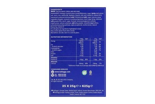 Kellogg’s toasted maize cereal (39%) (maize, sugar, BARLEY malt extract, salt, niacin, iron, vitamin B6, riboflavin, thiamin, folic acid, vitamin D, vitamin B12), sweetened condensed skimmed MILK (12%) (skimmed MILK, sugar), glucose syrup, vegetable oils (palm, coconut) in varying proportions, invert sugar syrup, skimmed MILK powder (5%), starch, sugar, fructose, humectants (glycerol, sorbitol), oligofructose, calcium carbonate, MILK whey powder, emulsifier (SOY lecithin), antioxidants (ascorbyl palmitate, alpha tocopherol), vanilla extract, natural flavouring, vitamin D.