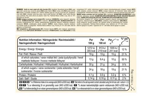 Reconstituted skimmed MILK, sugar, cocoa butter¹, water, coconut oil, glucose syrup, whole MILK powder, glucose-fructose syrup, whey solids (MILK), butter oil (MILK), skimmed MILK powder, emulsifiers (E471, E442, E476), exhausted vanilla bean pieces, stabilisers (E412, E410, E407), natural vanilla flavouring¹ (with MILK), flavouring, colour (E160a).
