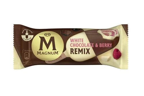 Blackcurrant-raspberry ice cream swirled with vanilla ice cream, white chocolate (27%) and milk chocolate (9%)