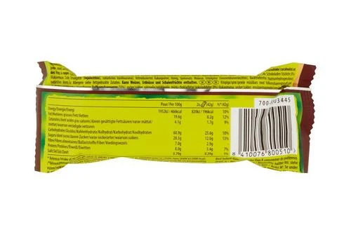 Whole grain rolled OATS(56%), sugar, sunflower oil, dark chocolate pieces (7%) (cocoa mass, sugar, emulsifier (SOY lecithin), natural vanilla flavouring), fat reduced cocoa powder, honey, salt, molasses, emulsifier (sunflower lecithin), raising agent (sodium bicarbonate), natural flavouring.