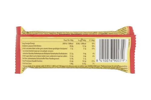 Roasted PEANUTS (38%), chicory root extract, isolated SOY protein, ALMONDS (9%), glucose syrup, palm fat, sugar, whey solids (MILK), fructose, maltodextrin, sunflower oil, tapioca starch, humectant (glycerol), salt, caramel powder (0.84%) (sugar, skimmed MILK powder), skimmed MILK powder, emulsifiers (sunflower lecithin, SOY lecithin), natural flavourings (contains MILK).