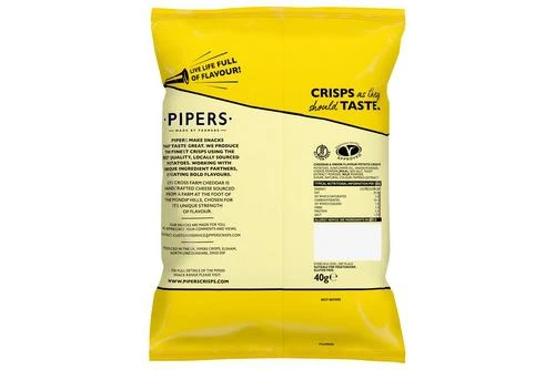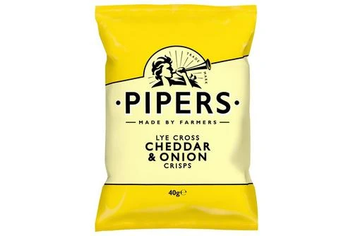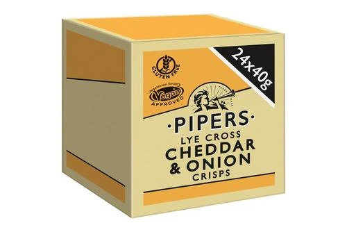 Case of 24 single packs of Pipers Lye Cross Cheddar & Onion Crisps (40g).