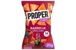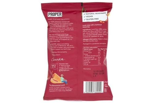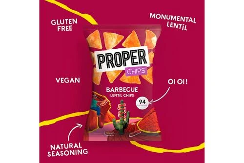 PROPERCHIPS Lentil chips with a barbecue seasoning At PROPER, taste is everything. And PROPERCHIPS is no exception. PROPER’s team of flavour makers have sourced the best quality, natural ingredients to coat these crunchy, lentil chips. Take this pack of Barbecue. We use a combination of sweet, spicy and smoky chipotle to season our lentil chips. The all vegan collection contains 30% less fat than leading crisps and under 100 kcal per serving. High in fibre and a source of protein, lentils give PROPERCHIPS a subtle, smooth creaminess and seriously satisfying crunch
