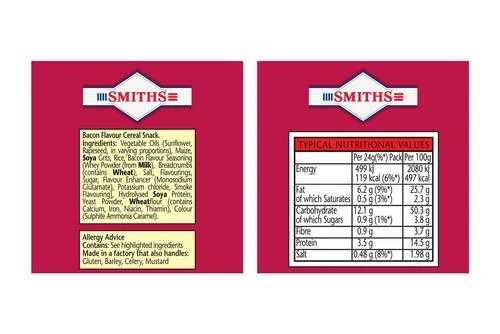 Vegetable Oils (Sunflower, Rapeseed, in varying proportions), Maize, SOYA Grits, Rice, Bacon Flavour Seasoning (Whey Powder (from MILK), Breadcrumbs (contains WHEAT), Salt, Flavourings, Sugar, Flavour Enhancer (Monosodium Glutamate), Potassium Chloride, Smoke Flavouring), Hydrolysed SOYA Protein, Yeast Powder, WHEATflour (contains Calcium, Iron, Niacin, Thiamin), Colour (Sulphite Ammonia Caramel)