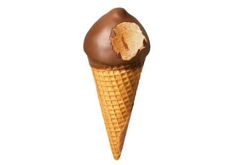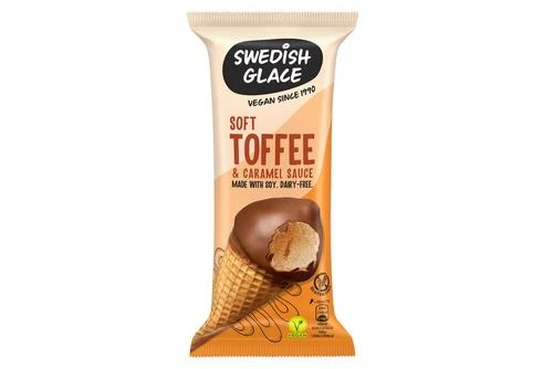 Toffee flavour soy ice cream in a corn waffle cone with a chocolate flavour coating, toffee flavour sauce (7.5%) and a chocolate flavour topping (7.5%)