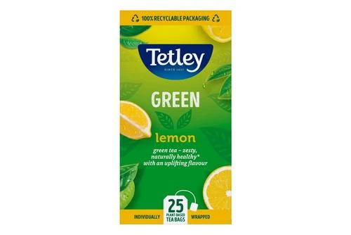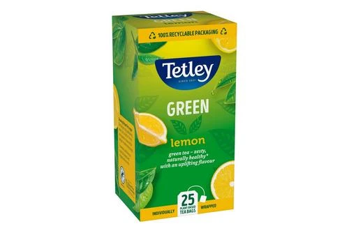 Tetley Green with Lemon Drawstring Tea individually sealed in a foil envelope