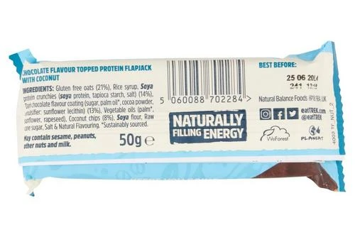 Gluten Free Oats (21%), Rice Syrup, Soya Protein Crispies (14%) (Soya Protein Isolate, Tapioca Starch, Salt), Dark Chocolate Flavour Coating (13%) [Sugar, Vegetable Fats (Palm Kernel*, Palm*, Shea) Fat-Reduced Cocoa Powder, Emulsifier: Lecithins], Vegetable Oils (Rapeseed, Palm*), Coconut Chips (8%), Soya Flour, Sugar, Natural Flavouring, Salt, *Sustainably sourced