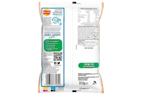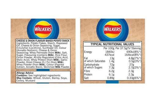 Case of 32 single packs of Walkers Baked Cheese & Onion Snacks (37.5G). Walkers Oven Baked Cheese & Onion 37.5g is the number 1 BFY Single SKU in Impulse and growing at 54% YOY (source: Nielsen, Total Impulse, MAT we 09.02.19) Walkers Oven Baked is the number 1 BFY Singles brand in Impulse and growing at 44% YOY (source: Nielsen, Total Impulse, MAT we 09.02.19) Our Walkers Baked Cheese & Onion Snacks 37.5g are recommended for stocking in Workplace, Education, Healthcare, Cafés & Pubs Walkers Oven Baked crisps are CQUIN Compliant Walkers Baked contains 50% less fat than regular potato crisps. Walkers Baked contain no MSG (Glutamate), Artificial Colours or Preservatives