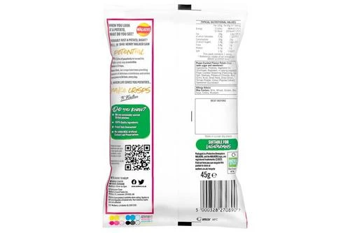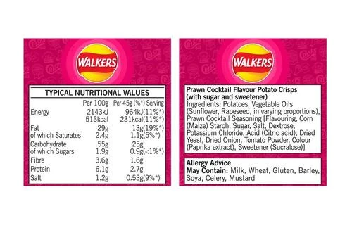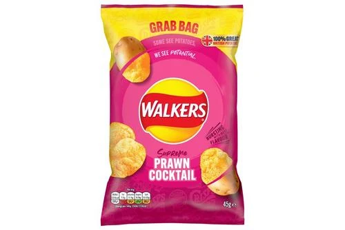 Case of 32 single packs of Walkers Prawn Cocktail Crisps (45G). Walkers Crisps is the biggest brand in Crisps & Snacks in Impulse, accounting for 17% of all CSN sales (source: Nielsen, Total Impulse, MAT we 09.02.19) Our Walkers Prawn Cocktail Crisps 45g are recommended for stocking in Workplace & Education This product is manufactured in the UK. Walkers Crisps are made with 100% Great British Potatoes. Walkers crisps contain no MSG (Glutamate), Artificial Colours or Preservatives