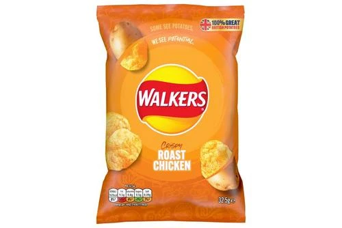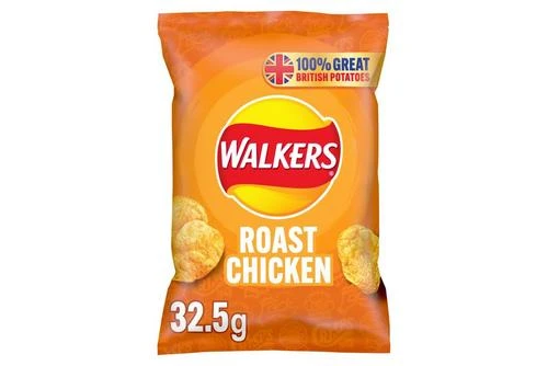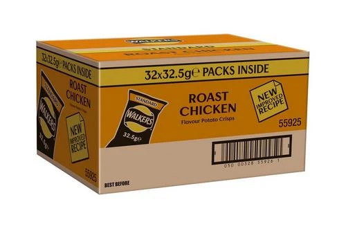 Case of 32 single packs of Walkers Roast Chicken Crisps (32.5G). Walkers Crisps is the biggest brand in Crisps & Snacks in Impulse, accounting for 17% of all CSN sales (source: Nielsen, Total Impulse, MAT we 09.02.19) Our Walkers Roast Chicken Crisps 32.5g are recommended for stocking in Workplace & Education This product is manufactured in the UK. Walkers Crisps are made with 100% Great British Potatoes. Walkers crisps contain no MSG (Glutamate), Artificial Colours or Preservatives